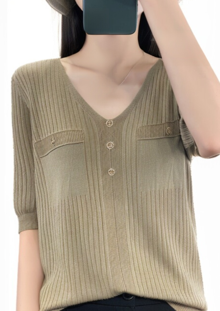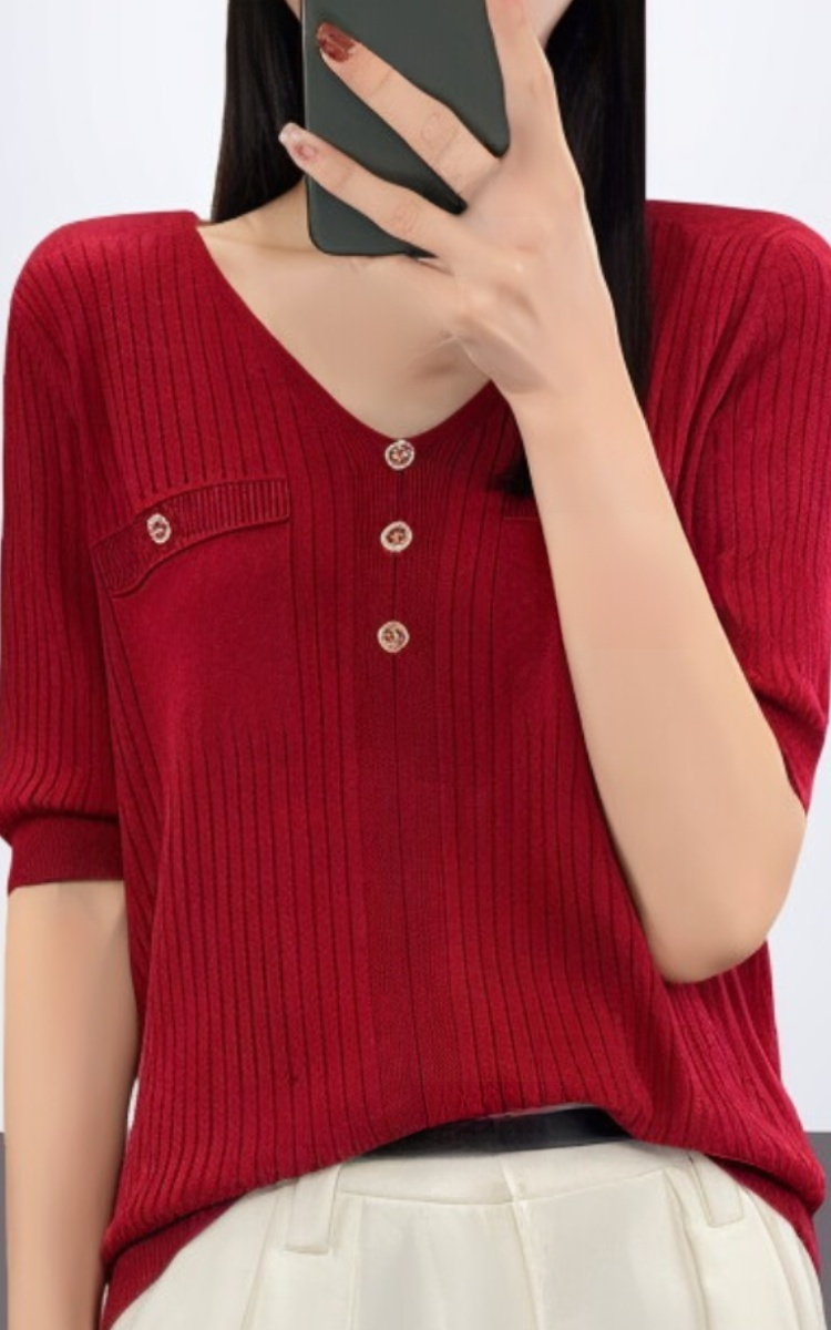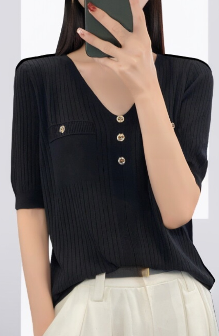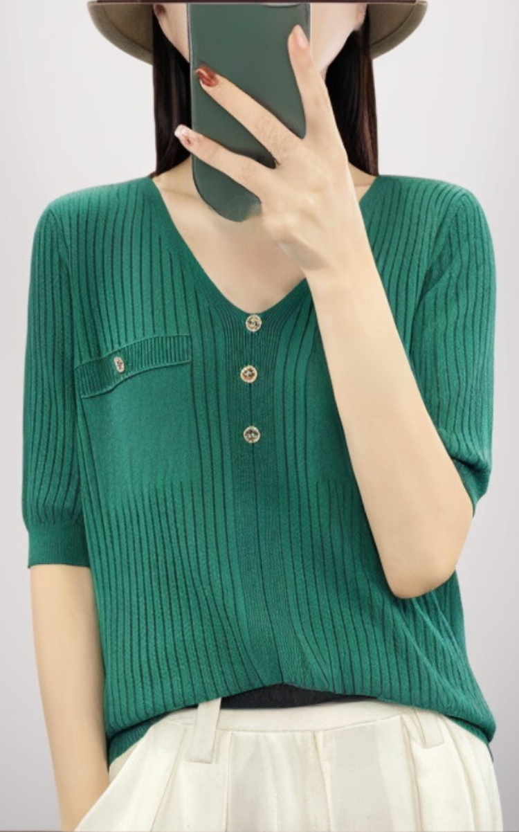 아이스실크 소재로 시원함 제공, V넥 디자인과 반팔 스타일로 여름 데일리룩에 적합, 가볍고 통기성 우수, 다양한 코디 연출 가능