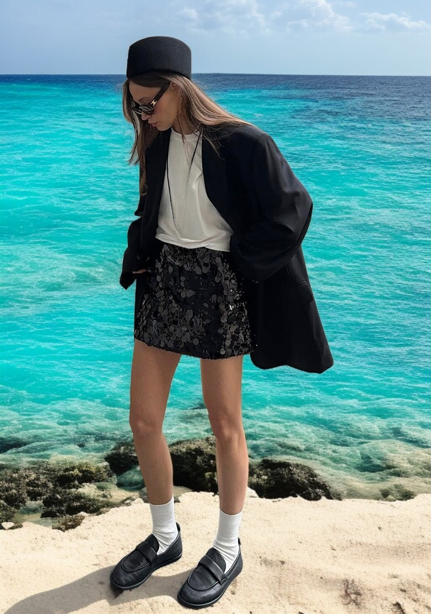 하이웨이스트 디자인으로 다리 길이 연출, 솔리드 컬러로 다양한 상의와 매치 가능, 스팽글 장식으로 포인트 연출, 데일리 및 파티룩에 적합